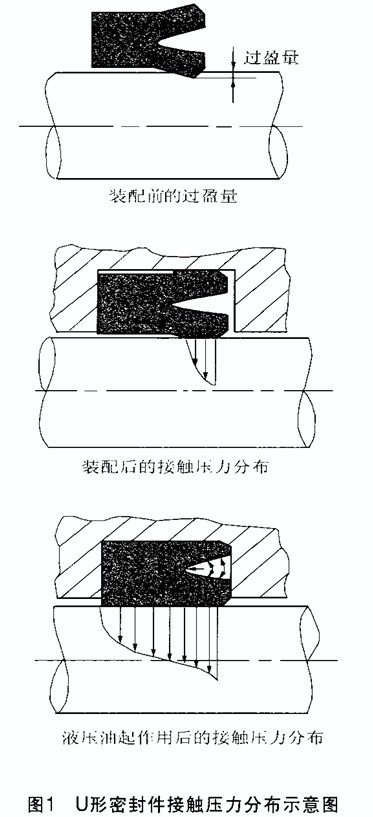 唇形密封件是指受壓呈唇形并具有壓力強化密封作用的一類密封件或襯墊。其結(jié)構(gòu)形式很多,除標(biāo)準(zhǔn)的V形、U形、Y形、L形和J形外,還有由這些形狀演變而來的各種特殊形狀。唇形密封件的密封原理是依靠密封件唇口與配合面之間的過盈量和工作介質(zhì)的壓力使唇形密封件產(chǎn)生彈性變形,以封堵相對運動兩零件之間的間隙,達(dá)到密封的目的。圖1是U形往復(fù)運動密封件( U形密封件是油壓缸中使用廣泛的油封,它是一種典型的唇口密封件,無論用于活塞或是活塞桿都能獲得良好的密封效果。主要應(yīng)用于重載行走機械或工業(yè)液壓中的活塞或活塞桿密封。)裝配和接觸壓力的分布示意圖,密封件裝入安裝槽時內(nèi)唇口與桿件相接觸發(fā)生變形,當(dāng)液壓油加壓后其整個滑動面與桿件的表面完全貼合在一起。