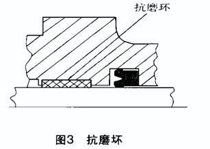 微動時低壓過高或行程過小,均會使油膜破裂、潤滑不足,造成表面鏡面磨損,應(yīng)改進(jìn)唇形密封件結(jié)構(gòu),增加抗磨環(huán)(見圖3);側(cè)壓過大,使抗磨環(huán)或活塞、軸承側(cè)向負(fù)茍過大,導(dǎo)致軸承磨損不均,若抗磨環(huán)不適合,也會造成滑動面不均勻磨損,應(yīng)當(dāng)更換抗磨環(huán);軸的偏心過大,使油封安裝孔與軸線不同心,活塞桿與缸頭、液壓缸缸筒和活塞的偏心值超出允許值,使唇形密封件不均勻磨損,從而造成漏油。此時,應(yīng)重新調(diào)整,使偏心量在允許的范圍內(nèi)。此外,配合面粗糙度大,會造成唇形密封件磨損量增大。實踐證明,軸表面粗糙度Ra=0.8~1.6μm、孔的表面粗糙度Ra=0.8~3.2μm時,就會使唇形密封件達(dá)到合理的壽命。