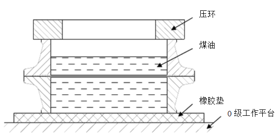 可以采用如圖方法,將成對(duì)清潔的浮封環(huán)對(duì)合好放在0級(jí)平臺(tái),底部可加橡膠墊或涂抹油脂,頂部加上配重的壓環(huán),倒入適量煤油,要求十分鐘沒(méi)有泄漏或滲油。