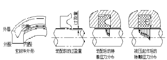 Y形密封圈的截面呈Y形,是一種典型的唇形密封圈。結構簡單、安裝簡單,使用壓力較高(高可達40Mpa),密封性能良好,密封性能隨壓力升高而提高,并能自動補償磨損量,摩擦力小,成本低,對油缸的表面要求也不高,是液壓缸使用廣泛的一種密封圈。按其截面的高、寬比例不同,可分為寬型、窄型、Yx型(兩唇不等高)等幾類,Y形密封圈依靠其張開的唇邊貼于密封副耦合面,并呈線狀接觸,在介質壓力作用下產生“峰值”接觸應力,壓力越高,應力越大。當耦合件以工作速度相對運動時,在密封唇與滑移耦合面之間形成一層密封液膜,從而產生密封作用(如圖3)。密封唇邊磨損后,由于介質壓力的作用而具有一定的自動補償能力。寬型Y型圈一般適用于壓力小于20Mpa、工作溫度-30~100度、速度小于0.5米/秒的場合。窄型圈是寬型Y圈的改型產品,其截面長寬比在2以上,不易翻邊,穩定性好。Yx型是窄型Y圈中不等高唇型號,有孔用和軸用之分,其短唇與密封面接觸,滑動摩擦力小,耐磨性好,壽命長,長唇與非運動表面有較大預壓縮量,摩擦阻力大,工作時不竄動。安裝 Y形密封圈時,唇口一定要對著壓力高的一側,才能起密封作用。活塞用Y型Yx型)活塞上都要安裝導向環,主要作用是 引導活塞做直線運動,防止活塞因受力不均造成的走偏導致內漏和減少密封件使用壽命等現象。