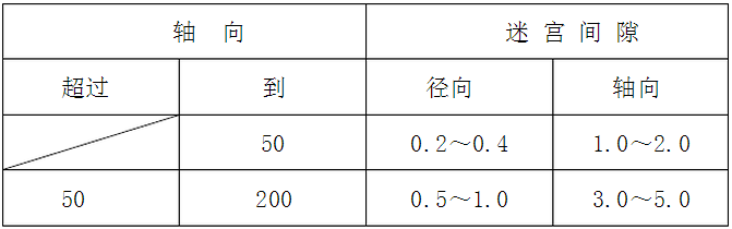 在軸向組合成凹凸式迷宮通路的密封件產品,多用于整體式軸承箱。徑向組合成凹凸式通路的迷宮密封,多用于剖分式軸承箱。軸有傾斜時,迷宮通路亦傾斜設置,以免凹凸部相互干涉。迷宮式密封,多用于剖分式軸承箱。軸有傾斜時,迷宮通路亦傾斜設置,以免凹凸部相互干涉。迷宮式密封的徑向及軸向間隙,通常采用下表所示值: